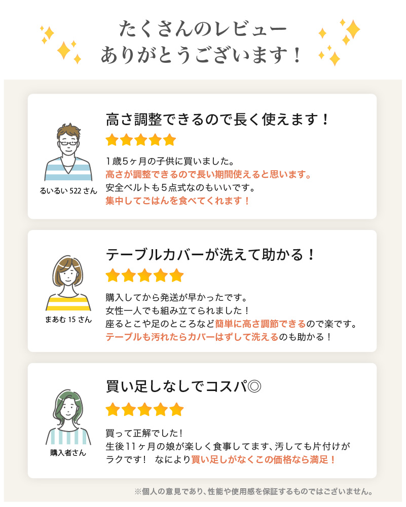1歳4ヶ月の息子に購入者 さん以前は友人から譲り受けたハイチェアで食べさせてましたが、ハーネスもなく立ち上がったり、反り返りが多くなってきたのでこちらを購入しました。クッション付きで座りやすそうですし、高さもすぐ変えられて良いです。配送も2日と早かったですし助かりました!ありがとうございました!このレビューは参考になりましたか?
